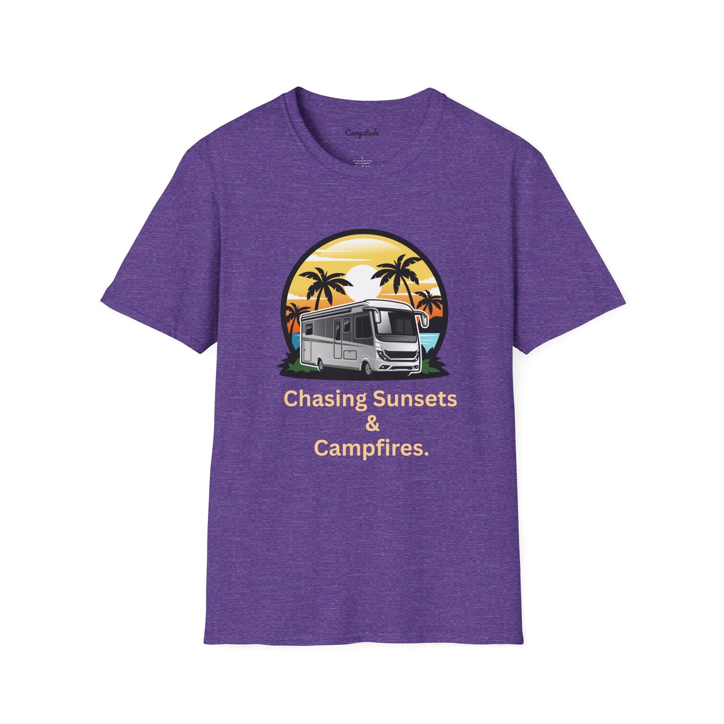 Experience comfort and style wherever your Class A RV adventures take you with this unisex softstyle t-shirt. Crafted for everyday wear, it features a seamless design that minimizes fabric waste while providing a clean, modern look. The ribbed collar ensures a secure and comfortable fit, while shoulder tape enhances seam durability for long-lasting wear. Its vibrant "Chasing Sunsets & Campfire" graphic captures the spirit of the open road and outdoor exploration, making it perfect for camping enthusiasts and travelers who value quality and style.