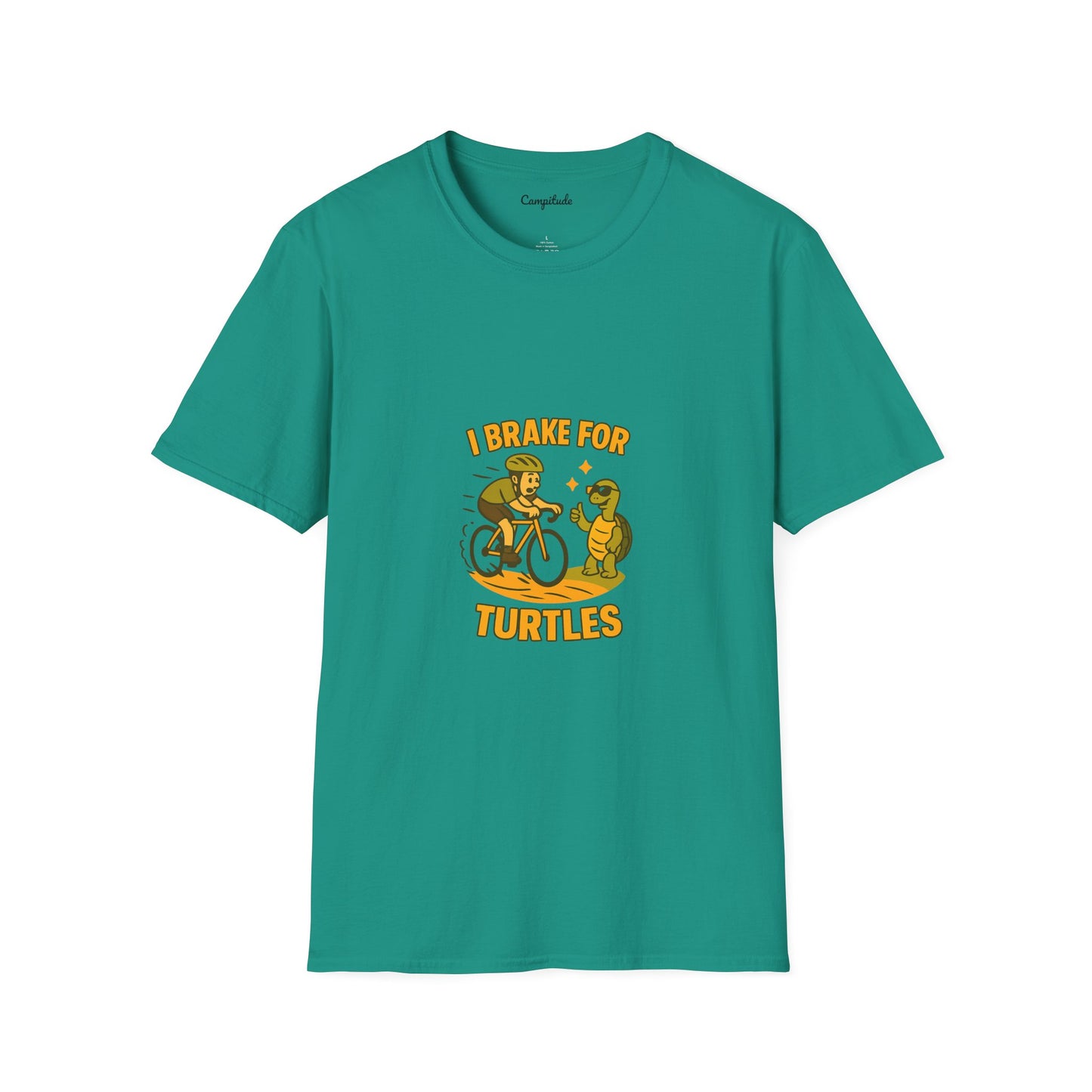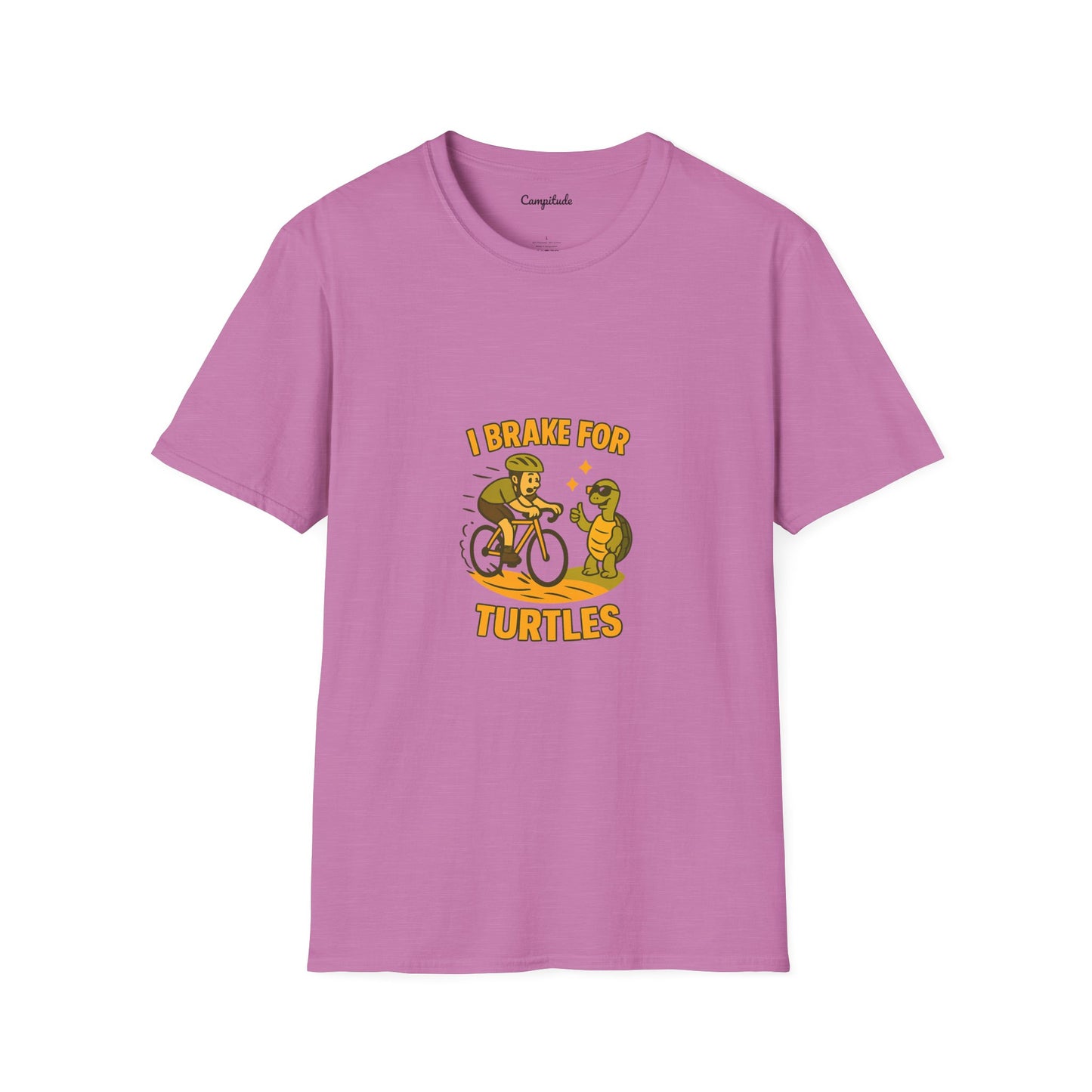 Celebrate your passion for cycling and turtles with this expertly crafted unisex softstyle t-shirt. Made of 100% ring-spun cotton, it offers exceptional comfort and breathability for long rides or casual wear. The seamless design enhances durability and a clean look, reducing fabric waste for an eco-friendly choice. Featuring a playful "I Brake for Turtles" graphic, this tee combines style with a meaningful message that resonates with nature enthusiasts and cyclists alike. Ideal for everyday use or as a thoughtful gift for Earth Day, birthdays, or special occasions.
